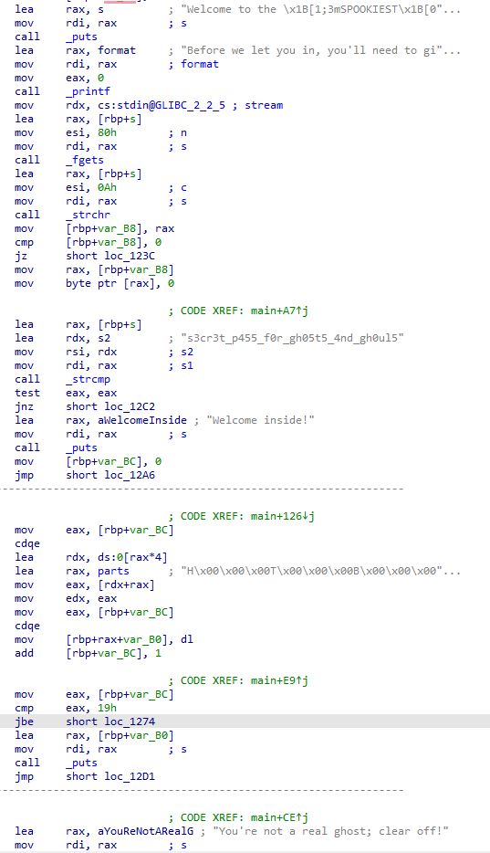 Luckily for us, the secret password is shown in plain text. The secret password is s3cr3t_p455_f0r_gh05t5_4nd_gh0ul5. Finding plaintext passwords in a binary is a common beginner challenge in Capture The Flag (CTF) competitions.