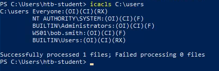By running the icacls C:\users command, I discovered that bob.smith had full control over the directory.