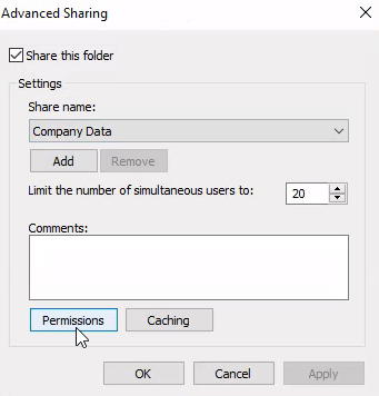 I created the shared folder called "Company Data" and then viewed the permissions in the Advanced Sharing menu.