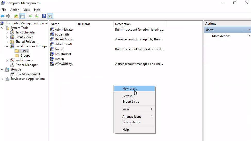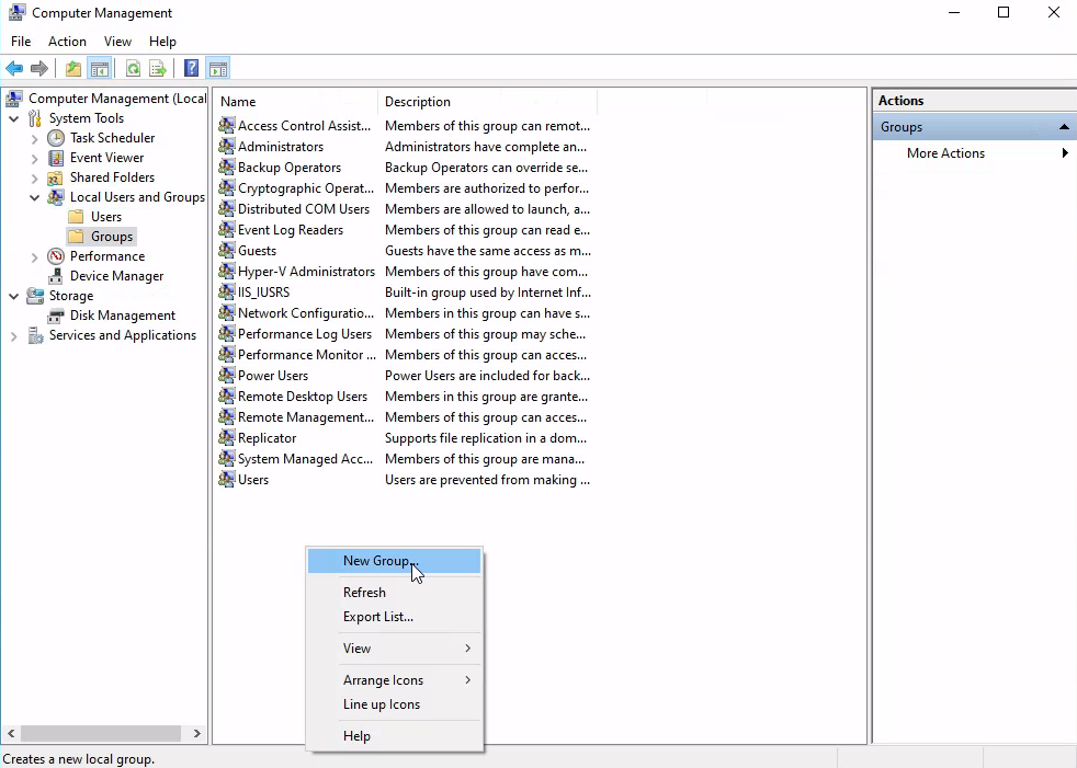 Once I created the user, I created the HR security group by going to the "Groups" menu in the Computer Management application.
