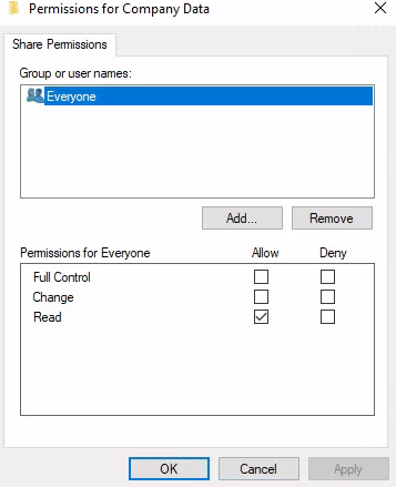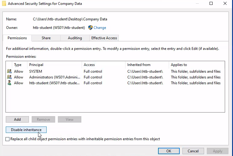 Then I set the NTFS permissions from the Security tab using the "Advanced Security Settings for Company Data" menu.