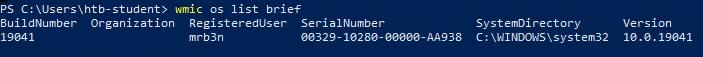 I ran the command wmic os list brief to find the serial number of the system.