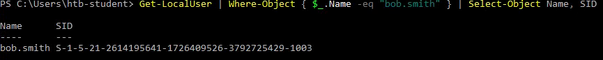 Get-LocalUser | Where-Object { $_.Name -eq "bob.smith" } | Select-Object Name, SID