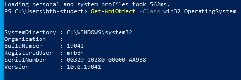$ xfreerdp /v:<IP> /u:htb-student /p:<PASSWORD>Once on the host, I opened PowerShell and enumerated the host. Using the Get-WmiObject command with the -Class win32_OperatingSystem argument provided basic information about the machine's operating system.